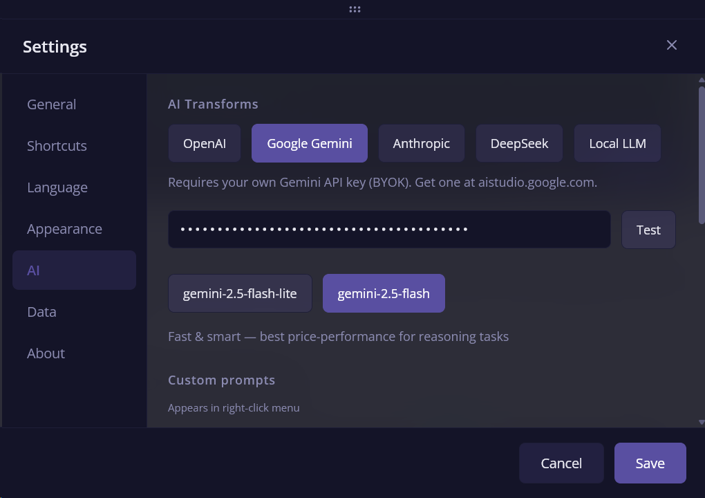 The Gemini free tier is the big one. Before v1.5.0, using AI transforms meant paying per token. Now you can use grammar fixes, translations, and summaries without paying a cent. Just grab a free key from AI Studio, paste it in, and you're set. DeepSeek is another budget option if you need something more capable than the free tier but don't want OpenAI pricing.