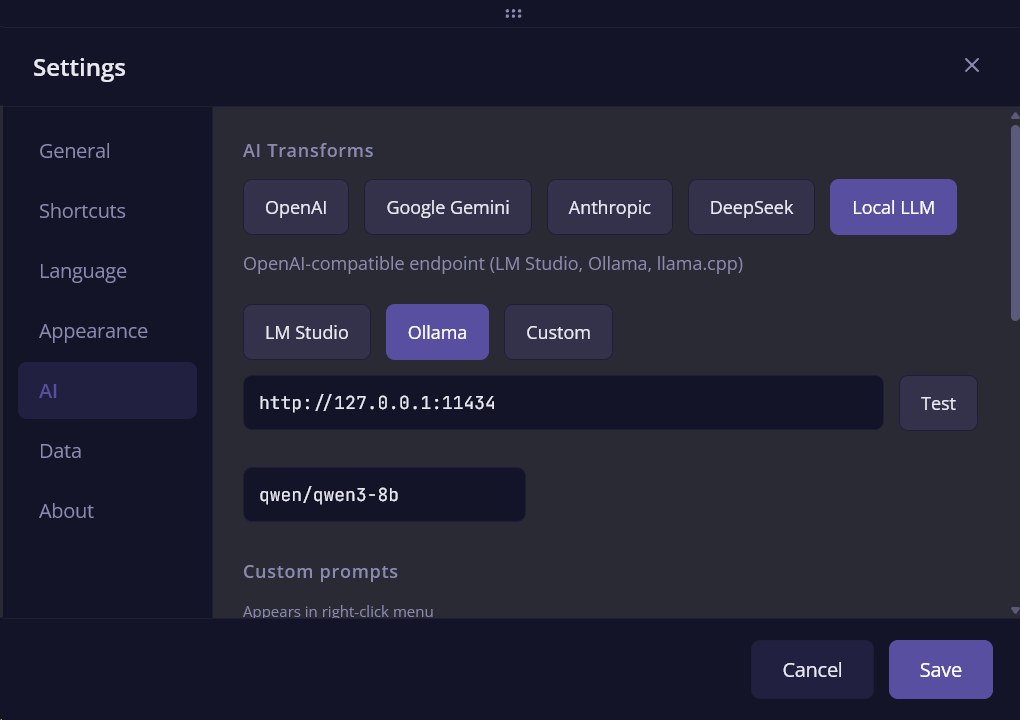 The fix wasn't "add more providers." It was redesigning the AI layer so providers are interchangeable. Every provider now shares the same prompts library, the same right-click transform menu, the same settings pattern. Switching providers changes nothing about how you use Beetroot — it only changes where the AI request goes.
