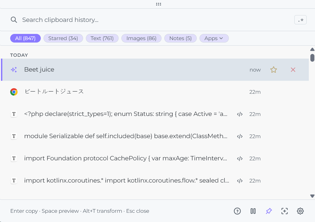 - Data stays local. The SQLite database, your clips, your history — nothing moved. AI transforms only send the selected text when you choose to transform it.