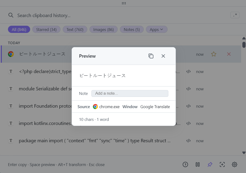 One more fix: copying from Beetroot's own preview panel now correctly shows Beetroot as the source app, instead of the last active window. Window titles and notes are now shown as subtitles in the clipboard list too, so you get more context without opening the preview.