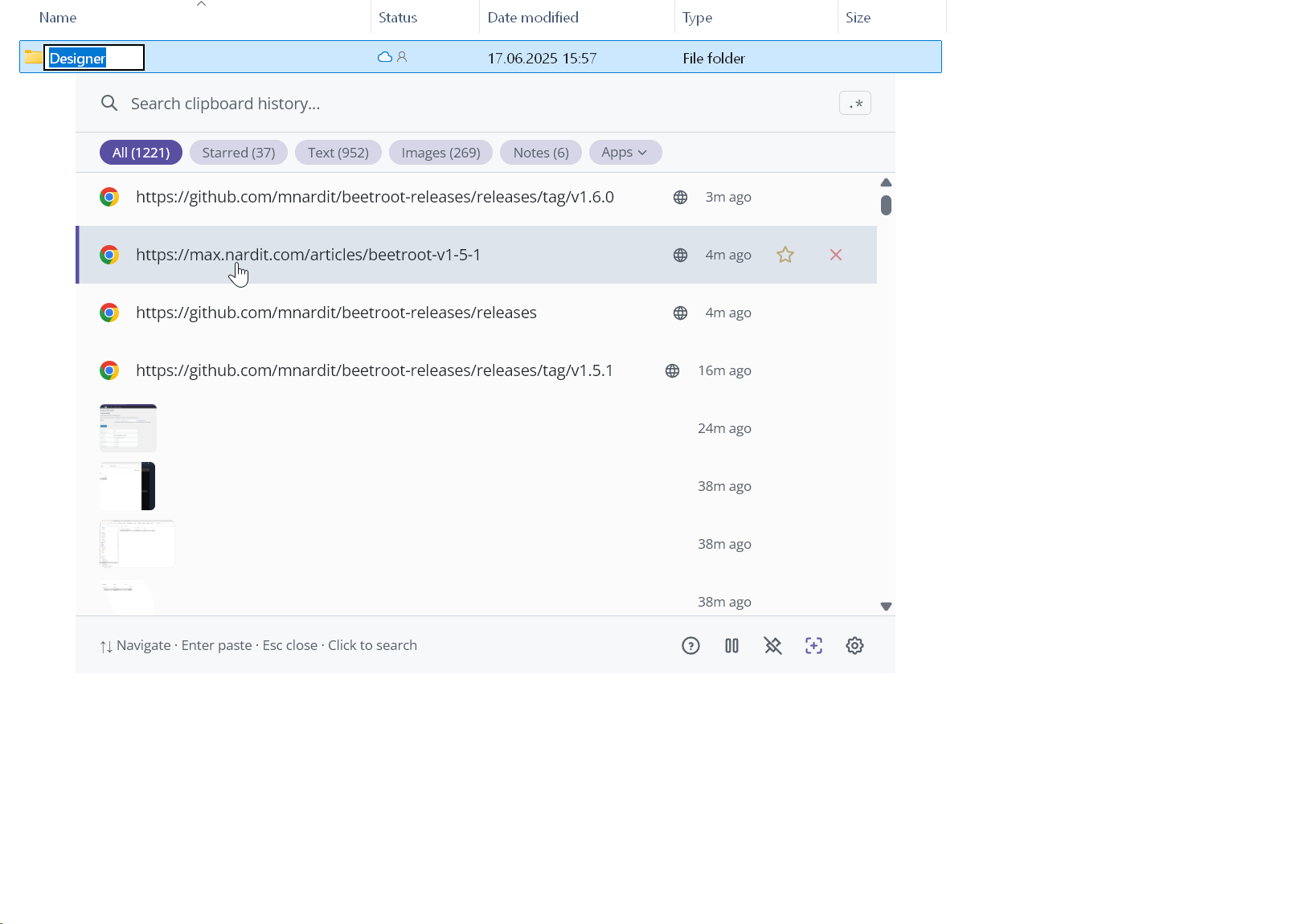 The single most annoying thing about Beetroot was that opening it stole focus. You're renaming a file in Explorer, hit F2, start typing — then open Beetroot to grab something from history, and Explorer loses focus. Your rename is gone. Same with IDE refactoring dialogs, search boxes, anything that relies on focus.