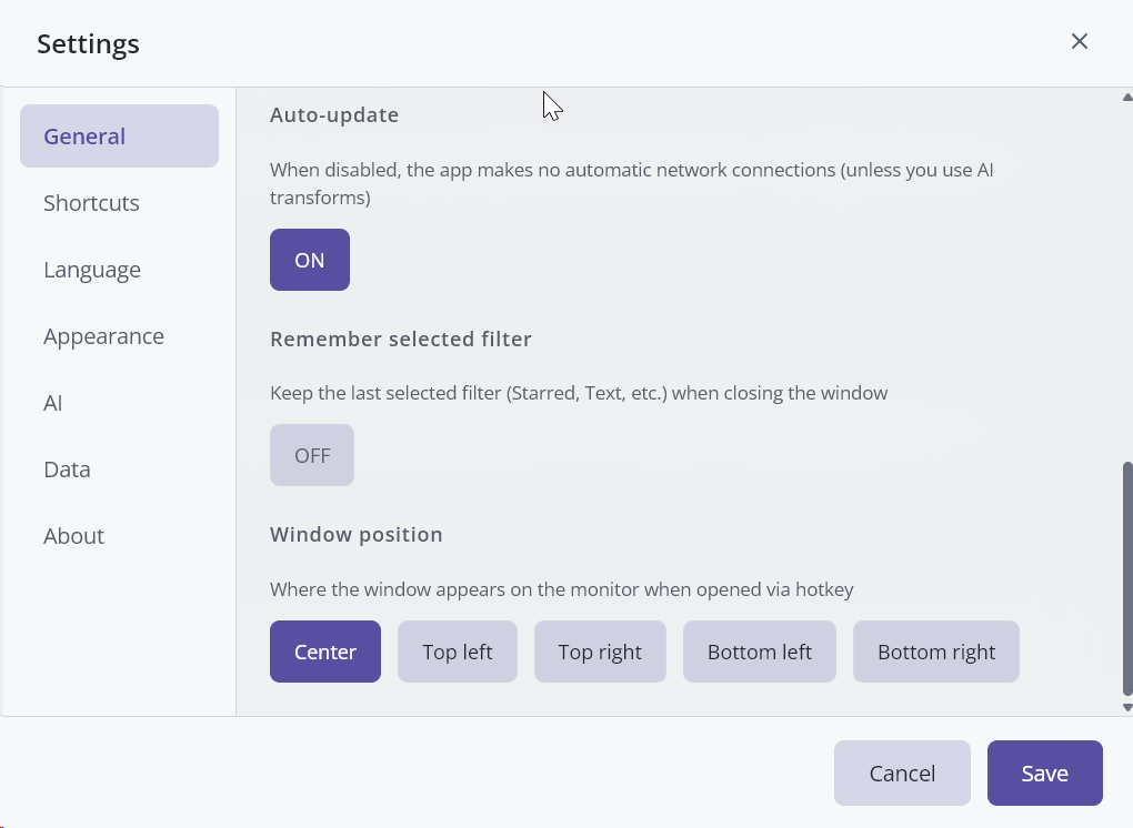 The same settings panel now has Remember selected filter — your last active filter (Starred, Text, Images, etc.) persists between opens instead of resetting to All every time.