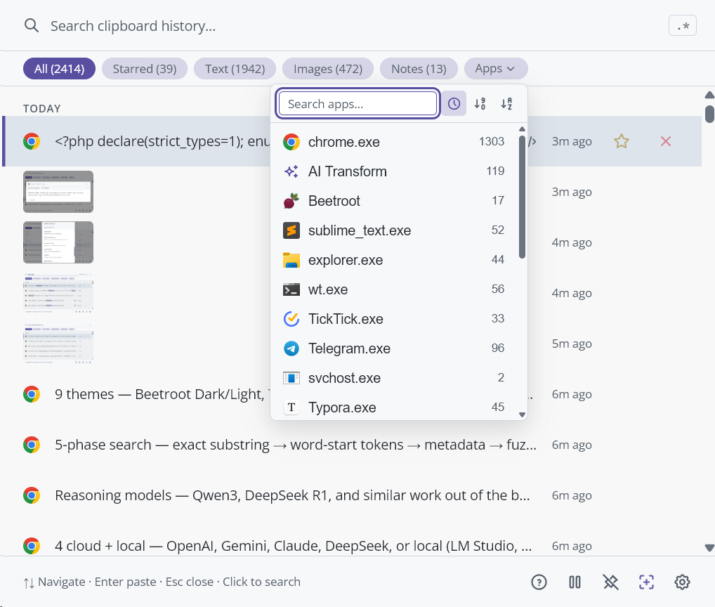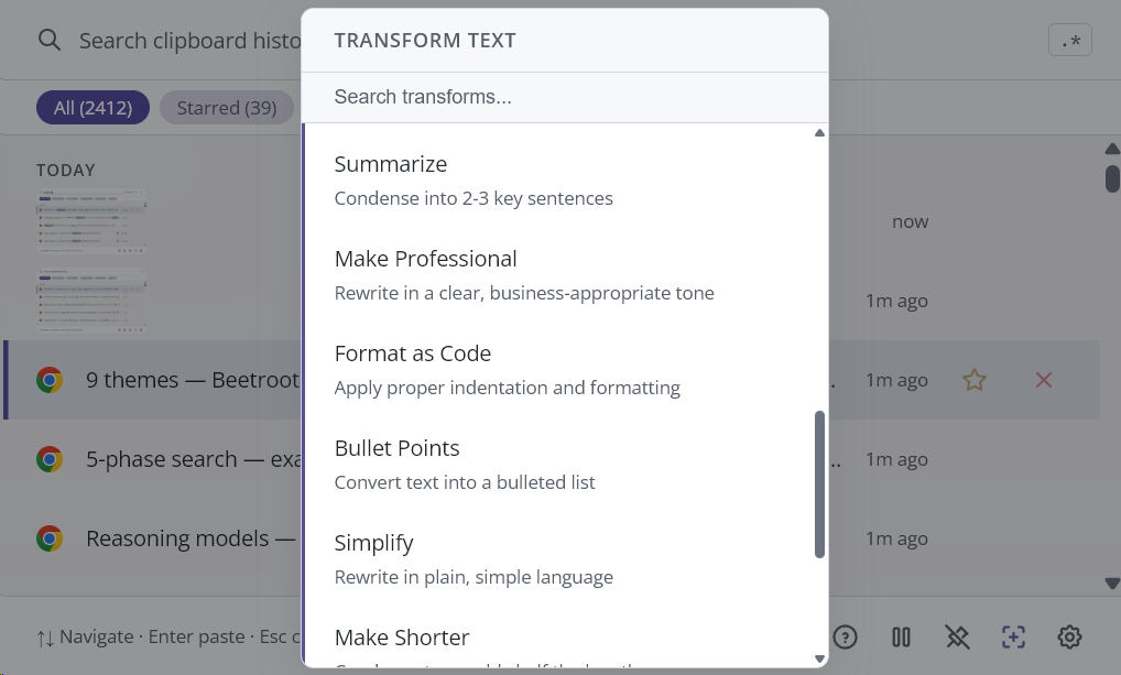 Beetroot is a clipboard manager for Windows. It automatically saves everything you copy -- text, images, code, URLs -- and lets you search, preview, transform, and paste any of it later. Think of it as an undo button for your clipboard that never runs out.