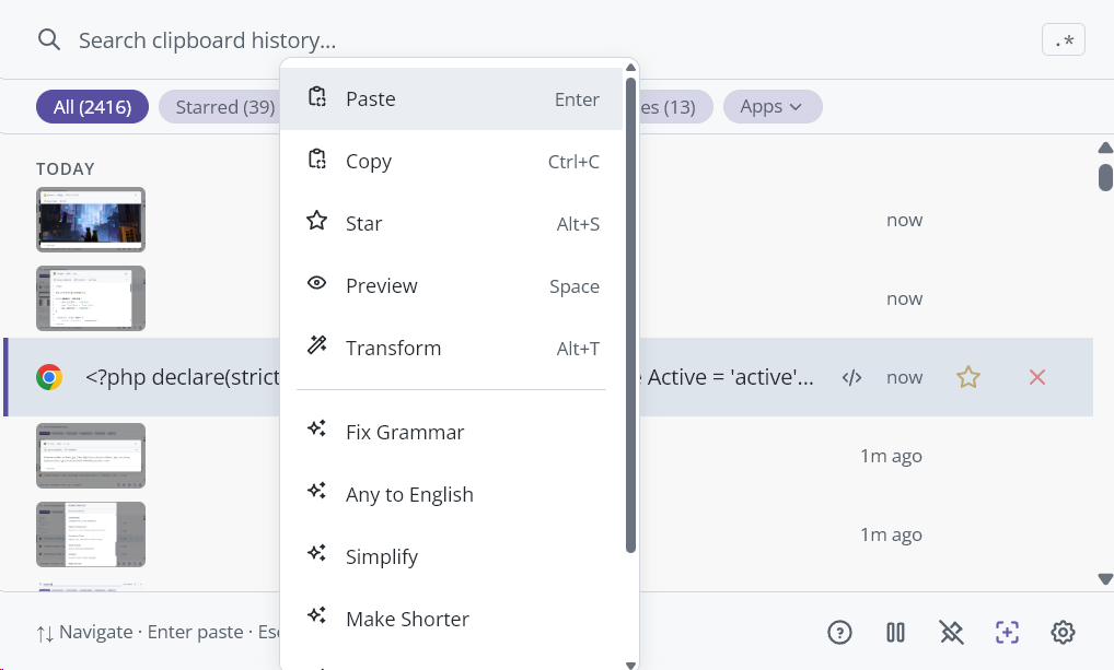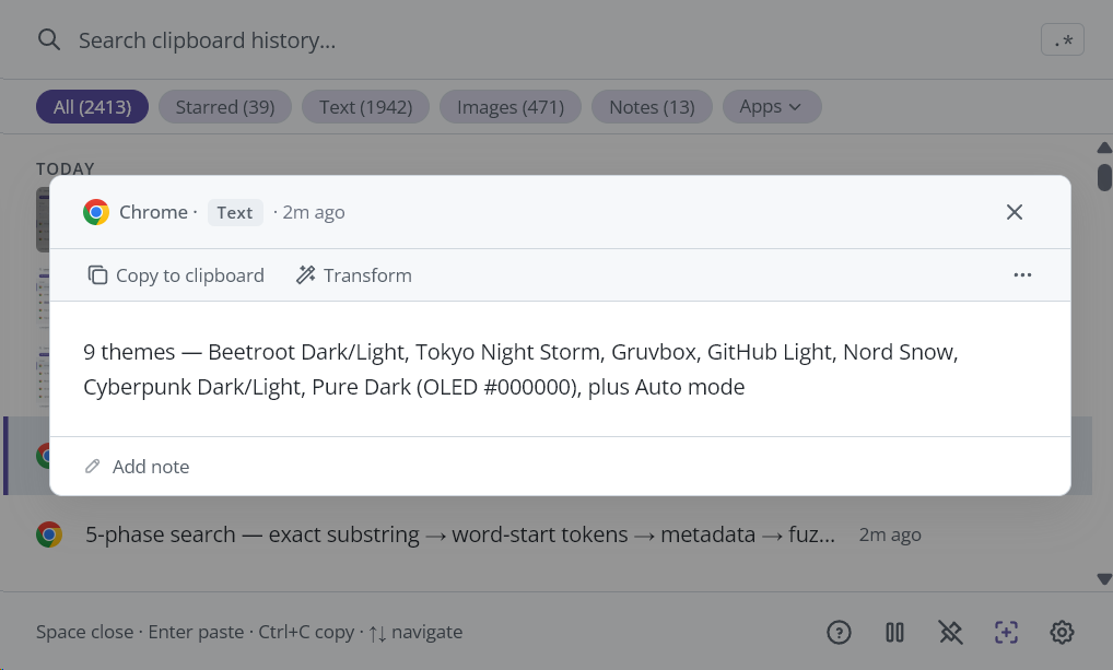 | Hint text | Shows key shortcuts: "Enter paste / Space preview / Alt+T transform / Esc close" (adapts based on context). |