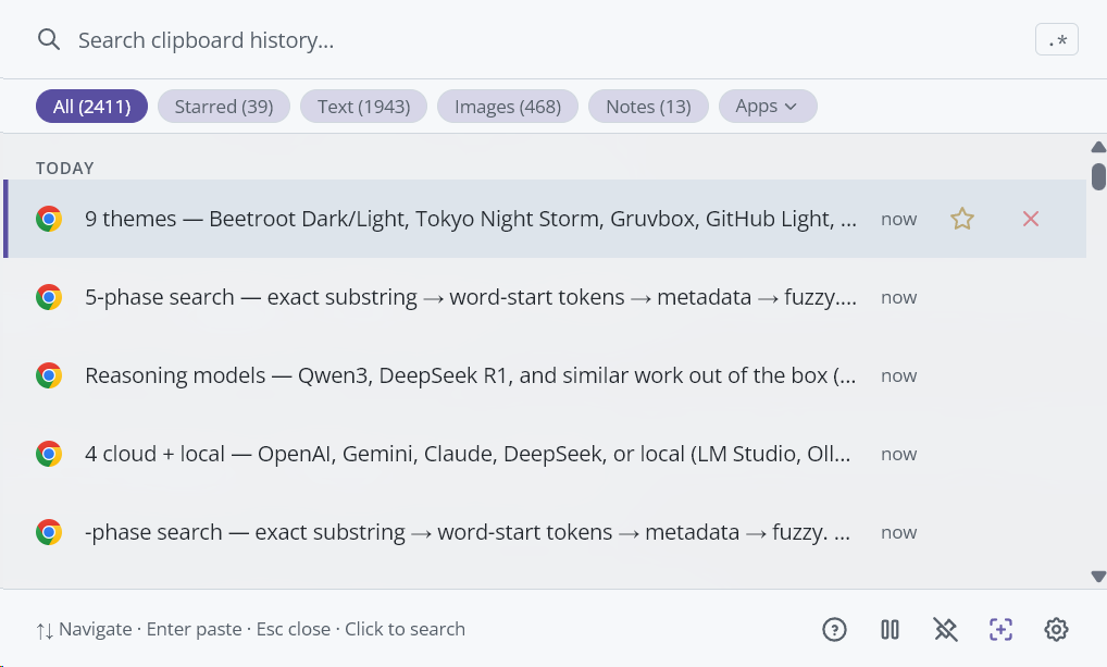 Tip: Search looks at clip content, notes, source app names, and window titles. If your normal search doesn't find what you need, try the regex toggle for pattern matching.