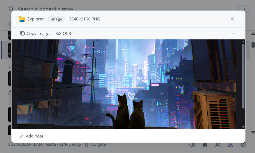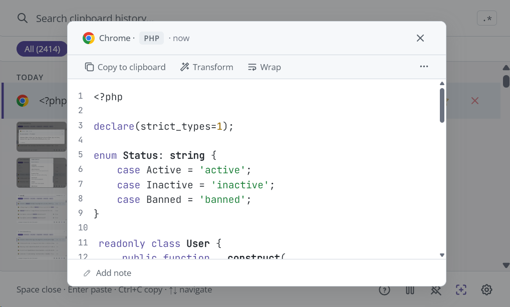 Preview a clip. Press Space to see the full content of any clip -- including syntax-highlighted code, full images, and metadata.