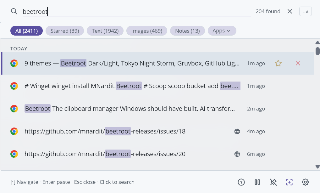 Search your history. Just start typing. Beetroot searches instantly across all your clips. Press Enter to paste the selected result.