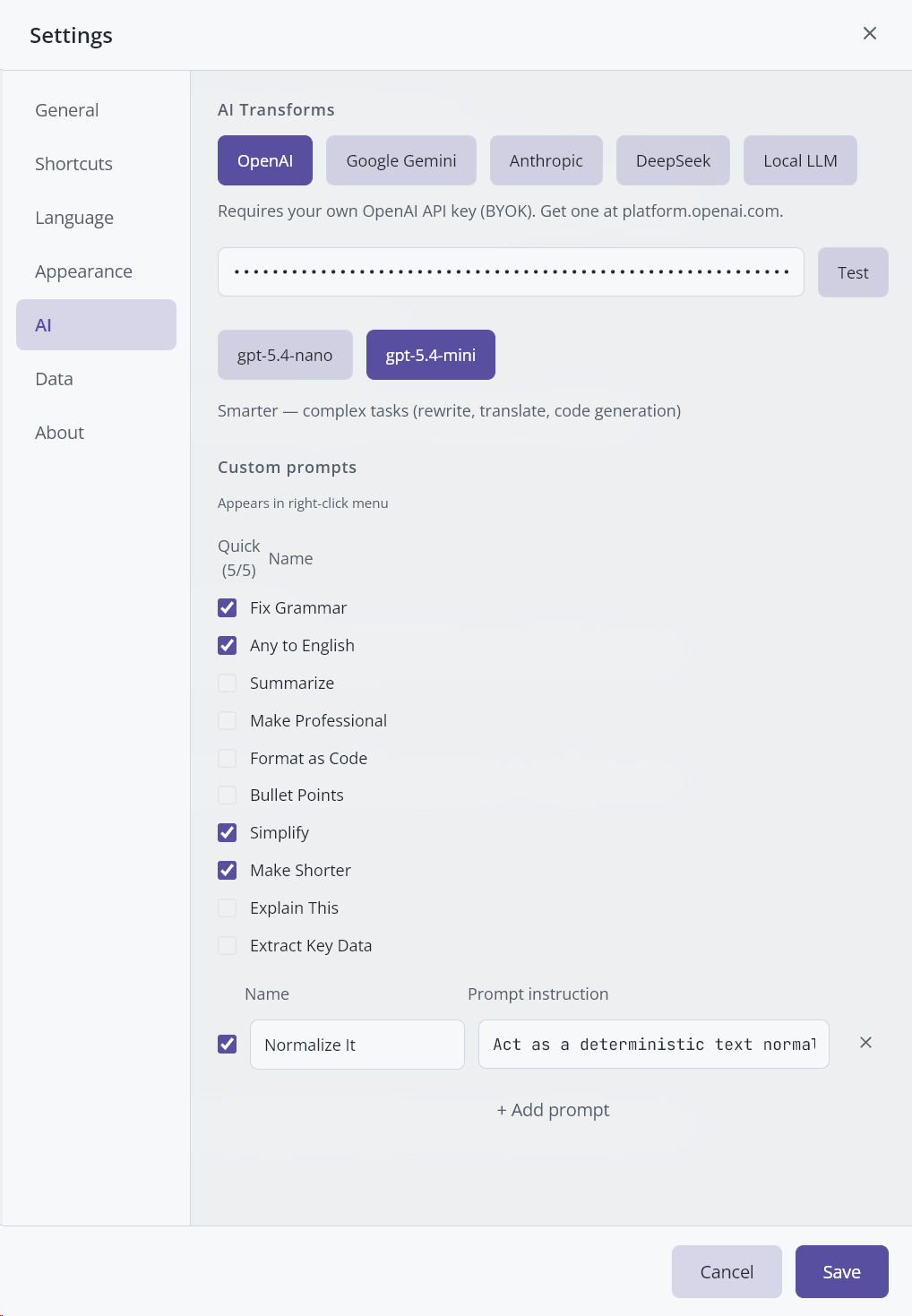 | Provider | OpenAI, Google Gemini, Anthropic, DeepSeek, Local LLM | OpenAI | Which AI service to use for transforms. |