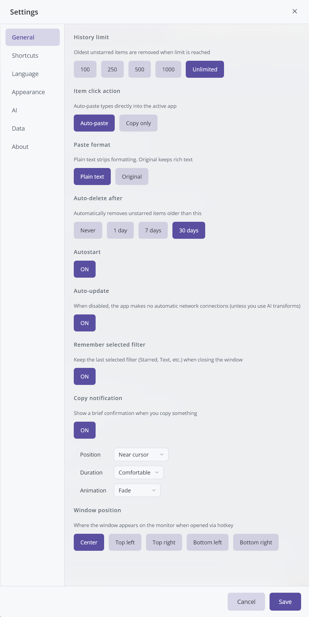 | Copy notification | ON / OFF | ON | Show a brief confirmation when you copy something. |