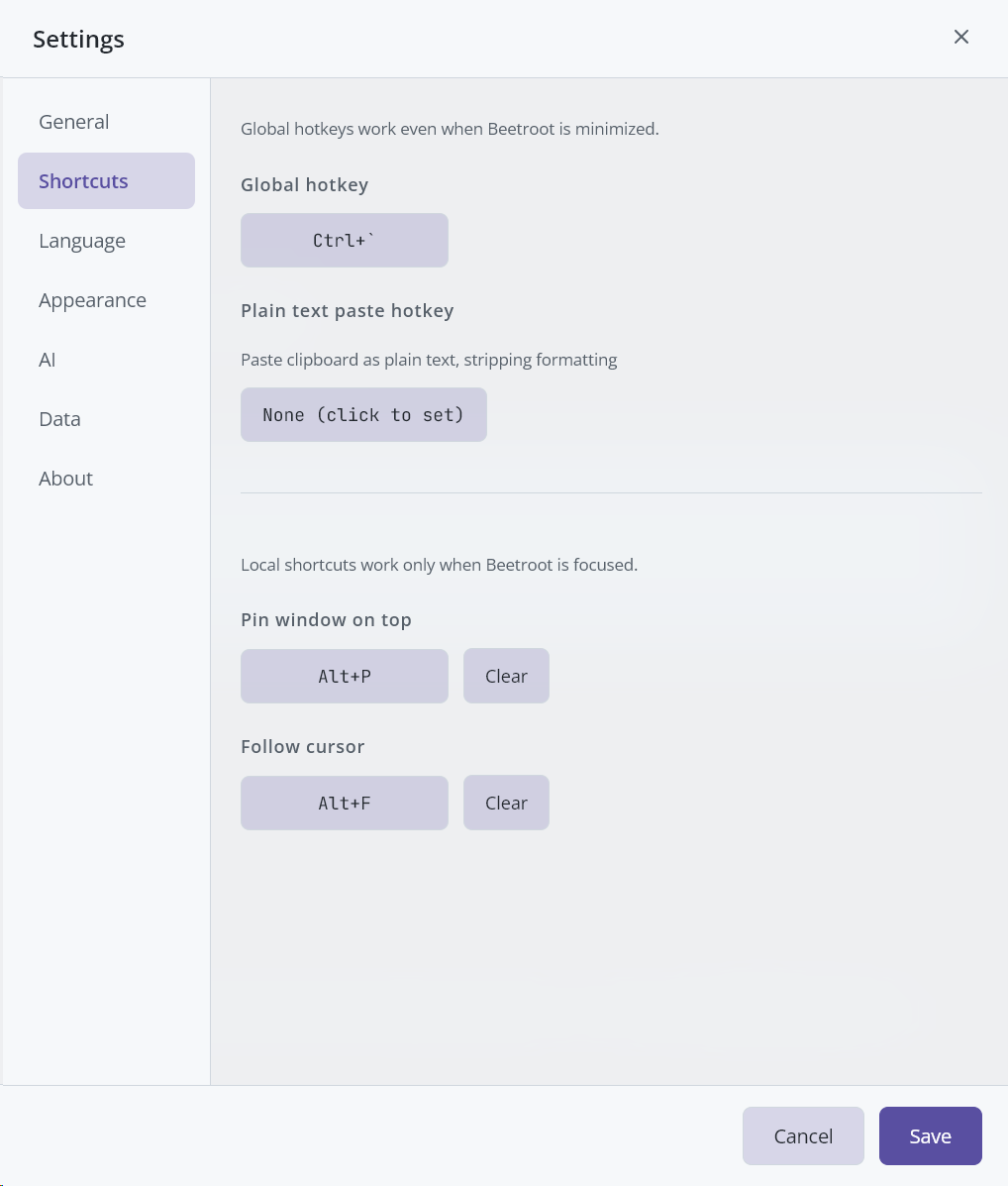 | Global hotkey | Ctrl+` (backtick) | Yes | Show/hide the Beetroot window. |